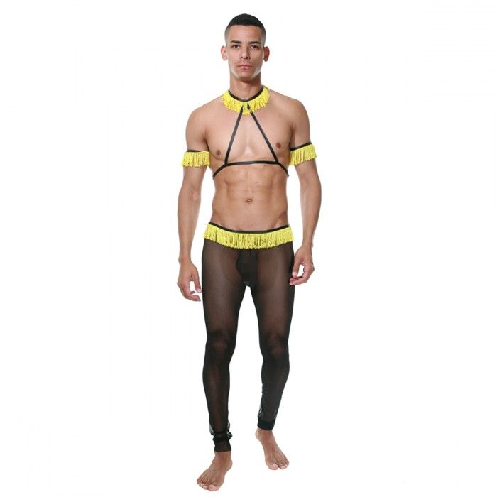 Мужской костюм танцора, состоящий из штанов из полупрозрачной легкой черной ткани и аксессуаров на руки, шею и грудь из черных ремешков и желтой бахромы. В комплекте: штаны, воротник со стрепами, 2 нарукавника.