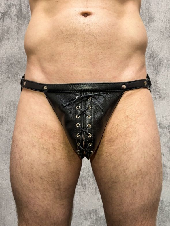 Мужские эротические трусы со шнуровкой - пикантная модель, которая создана, чтобы соблазнять и завораживать. Трусики-джоки выполнены из натуральной мягкой овечьей кожи, очень приятный к телу, под ягодицами расположены эластичные резиночки. Модель декорирована качественной металлической фурнитурой, обхват пояса регулируется с помощью пряжки, диапазон регулировки обхвата от 75 до 100 см. Главной изюминкой этих трусов является шнуровка спереди, что дает фантазии разыграться и может помочь разнообразить Вашу эротическую сессию.