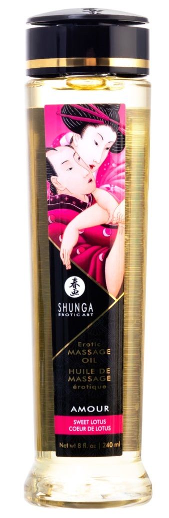 Массажное масло с ароматом цветков лотоса Amour Sweet Lotus. 100% натуральные масла холодного отжима, с витамином Е (антиоксидант), без жирных остатков, не забивает поры, нет минерального или животного масла. Мягкость и шелковистость этого масла с приятным скользящим эффектом на коже вызывает ощущение полного восторга. Сексуальное желание нарастает и вы готовы к любви. Получите взаимное удовольствие от чувственного эротического массажа с использованием нашей эксклюзивной смеси масел холодного отжима, тщательно отобранных за свои стимулирующие и придающие энергию свойства. Масло легко скользит по коже, не оставляя жирных ощущений, в то время как различные экзотические ароматы поднимут ваши чувства до вершин возбуждения. Идеально подходит для того, чтобы насладиться расслабляющим массажем или сделать его, совместив с обволакивающими обольстительными ласками. Это на 100 % натуральное масло с упоительным ароматом, легко скользит по коже, не оставляя жирной пленки. Запах массажному маслу придают эфирные масла и отдушки, что в отличие от большей части другой продукции SHUNGA, ароматизированной вкусовыми добавками, делает его несъедобным.