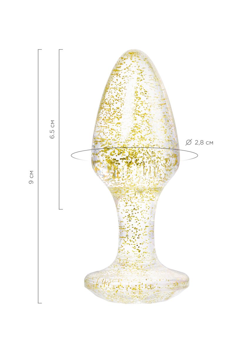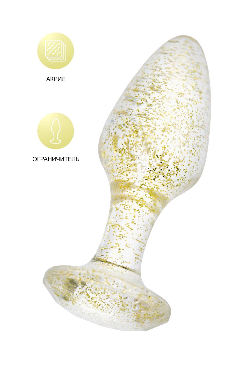 Анальная втулка классической формы выполнена из акрила. Прозрачный материал с золотистыми блестками внутри. Ограничительное основание обеспечивает безопасность при использовании, поэтому втулку высоко ценят не только опытные любители анального секса, но и новички. Рабочая длина - 6,5 см.