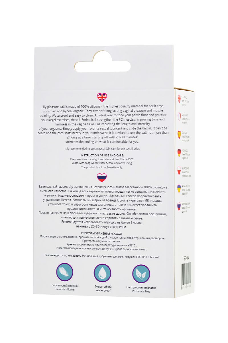 Вагинальный шарик Lily выполнен из нетоксичного и гипоаллергенного 100% силикона высокого качества. На конце есть веревочка, позволяющая легко вводить и извлекать игрушку. Водонепроницаем и прост в уходе. Идеальный способ попрактиковать упражнения Кегеля. Вагинальный шарик от бренда L’Eroina укрепляет ЛК-мышцы, улучшает тонус и упругость мышц влагалища, а также помогает увеличить продолжительность и интенсивность оргазмов. Просто нанесите ваш любимый лубрикант и вставьте шарик. Он абсолютно бесшумный, а петлю для извлечения легко спрятать в нижнем белье. Вес - 35 гр.