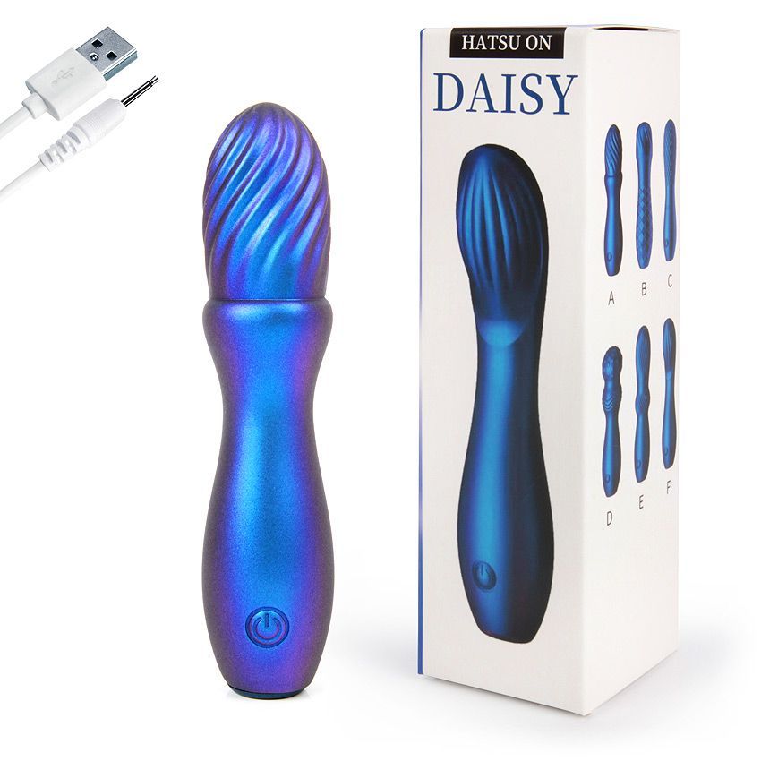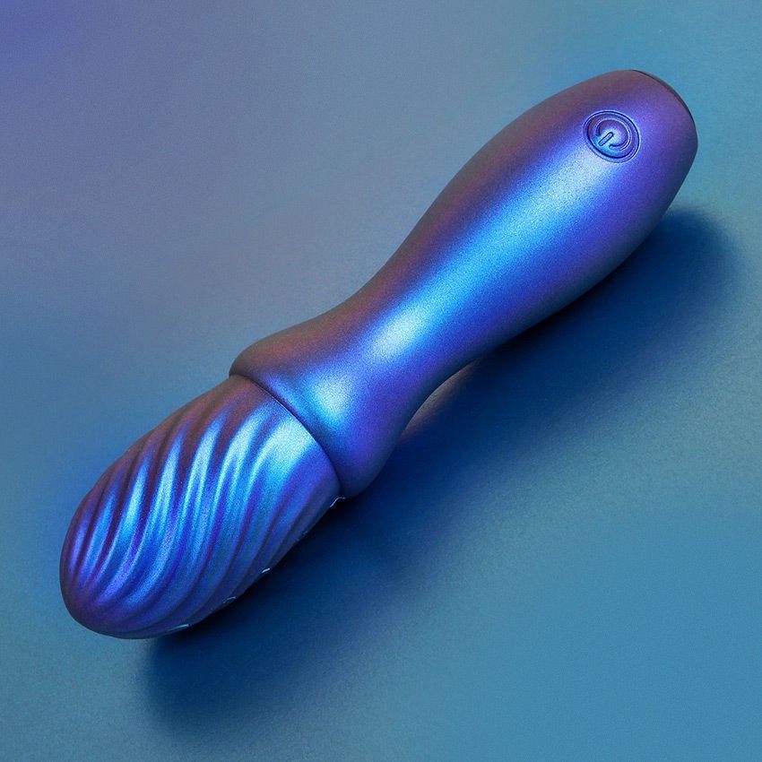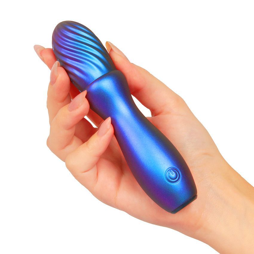 Синий вибромассажёр со спиралевидным рельефом. Имеет 10 режимов вибрации. Перезаряжаемый.